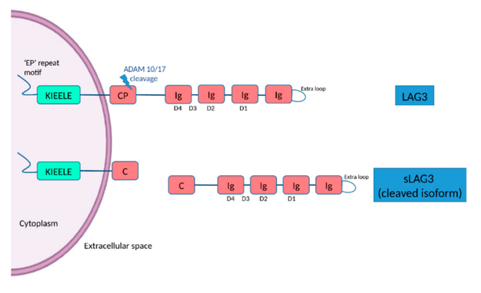 LAG-3的D4和跨膜区之间的存在一个较长的氨基酸序列称为“连接肽”。基于小鼠模型,发现金属蛋白酶ADAM10和ADAM17可以在CP处裂解LAG-3,并以可溶性形式释放LAG-3胞外区域。因此,ADAM10和ADAM17可能通过调节细胞表面LAG-3的数量来调节LAG-3的抑制作用。人与小鼠CP的氨基酸序列同源性较低,因此人类LAG-3是否也能被这些金属蛋白酶裂解,还有待进一步研究。