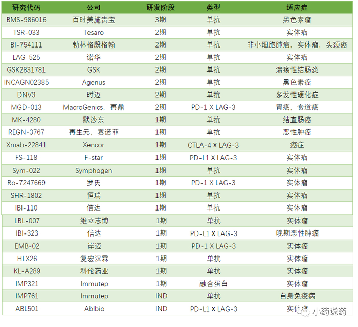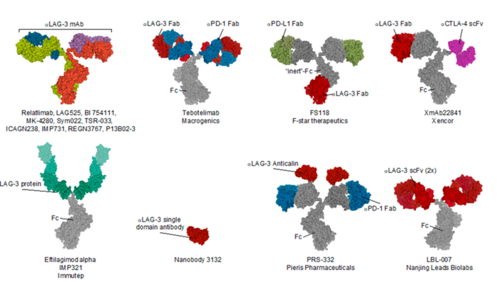 基于临床前的观察,尤其是与针对PD-1的药物联合使用带来的益处。到目前为止,已经开发出至少20种针对LAG-3的药物。包括抗LAG-3阻断性抗体(relatlimab(BMS-986016)、Sym022、TSR-033、REGN3767、LAG525、INCAGN2385-101、MK-4280和BI754111)以及拮抗双特异性抗体(MGD013(抗PD-1/LAG-3)、FS118(Anti-LAG-3/PD-L1)和XmAb22841 (anti-CTLA-4/LAG-3))等。