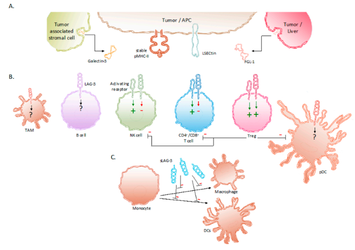 LAG-3在活化的NK细胞上表达的直接作用尚不完全清楚。然而,在同时表达NK受体和T细胞受体的NKT细胞上,LAG-3已显示出下调其增殖的作用。B细胞上LAG-3的表达已被证明是T细胞依赖性的,通过产生IL-10发挥免疫抑制活性。此外, LAG-3在TAMs中也有表达,尽管作用尚不完全清楚,但可以推测TAM上的LAG-3表达有助于其肿瘤促进功能。