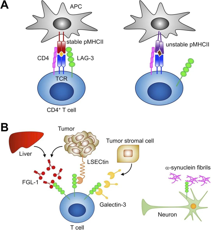 除了免疫抑制作用外,LAG-3似乎在神经系统中也有明显的作用。Mao等人报道LAG-3可以与α-突触核蛋白纤维结合,这与帕金森病的发病机制有关。α-突触核蛋白纤维与LAG-3的结合触发了α-突触核蛋白纤维的内吞作用、细胞间传递和神经毒性。