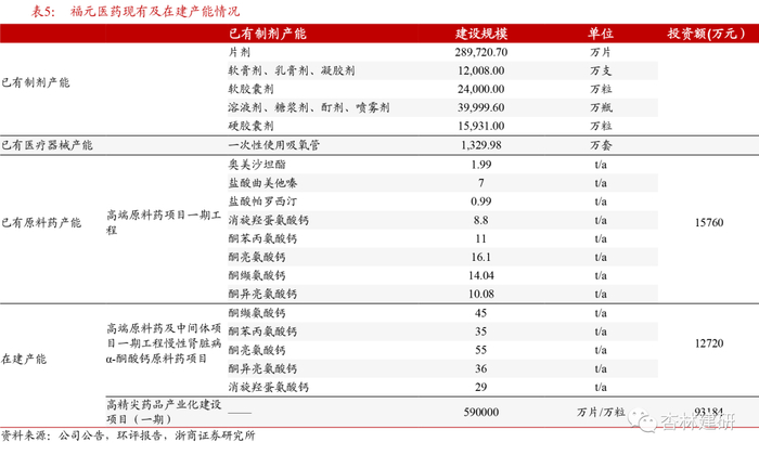原料药配套,期待后续在建原料药产能释放,增强一体化竞争优势。根据公司招股书,“公司已具备酮酸系列原料、盐酸曲美他嗪、奥美沙坦酯、盐酸帕罗西汀等原料药量产能力,并针对重点在研仿制药品种同步研发对应原料药”。目前公司原料药生产主要由北京福元沧州分公司生产,安徽福元也有部分产能,公司现有的原料药产能约为70 t/a,在建的原料药项目“高端原料药及中间体项目一期工程慢性肾脏病α-酮酸钙原料药项目”建设完成后,将达到年产200吨原料药的产能。我们认为,未来随着公司原料药配套有助于供应稳定以及成本控制