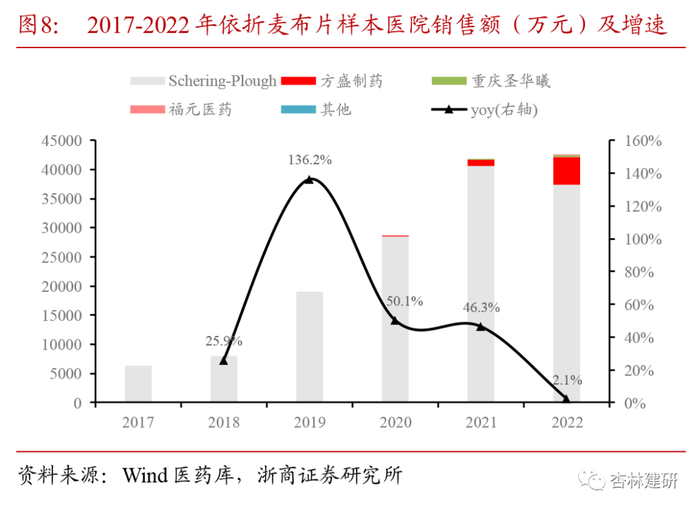 增量中标:第七批集采增量中标品种有放量空间,有望贡献2023年收入和利润增量。复盘公司的历史增长,我们预计第三批集采(2个品种中标)、第四批集采(3个品种中标)增量品种以价换量,分别带动公司2021-2022年收入和利润增长,具体看:2021年奥美沙坦酯片(2020年中标)、格列齐特缓释片(2021年中标)、替米沙坦片(2021年中标)、瑞格列奈片(2021年中标)的销量均大幅超过集采中标量。展望2023年,我们预计2022年第七批集采中标的依折麦布片有望贡献收入增量,综合考虑到该产品相对较大的市场空间(2022年样本医院销售额约4.3亿元)和较高的原研市占率(2022年先灵葆雅市占率87.8%),我们看好该产品的放量空间。