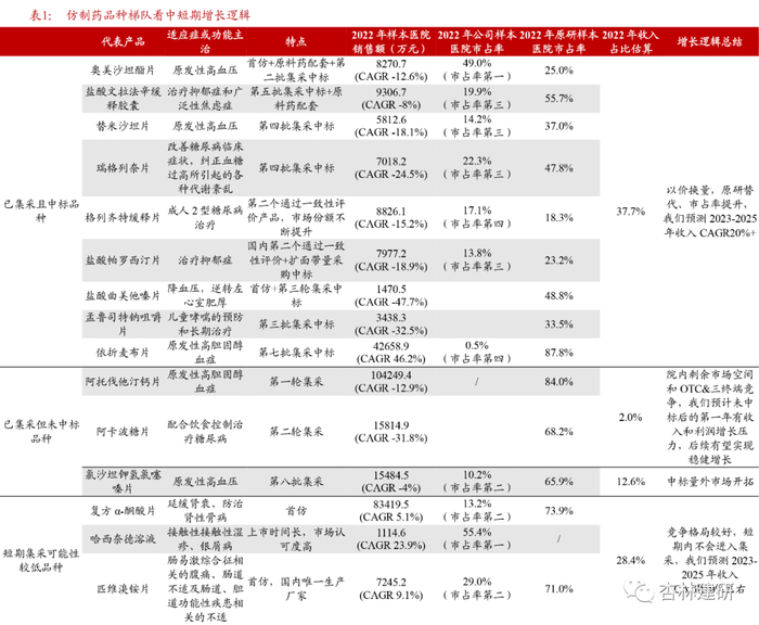 增量中标:第七批集采增量中标品种有放量空间,有望贡献2023年收入和利润增量。复盘公司的历史增长,第三批集采(2个品种中标)、第四批集采(3个品种中标),我们预计增量品种以价换量,分别带动公司2021-2022年收入和利润增长,具体看:2021年奥美沙坦酯片(2020年中标)、格列齐特缓释片(2021年中标)、替米沙坦片(2021年中标)、瑞格列奈片(2021年中标)的销量均大幅超过集采中标量。展望2023年,我们预计2022年第七批集采中标的依折麦布片有望贡献收入增量,综合考虑到该产品相对较大的市场空间(2022年样本医院销售额约4.3亿元)和较高的原研市占率(先灵葆雅市占率87.8%),我们看好该产品的放量空间。