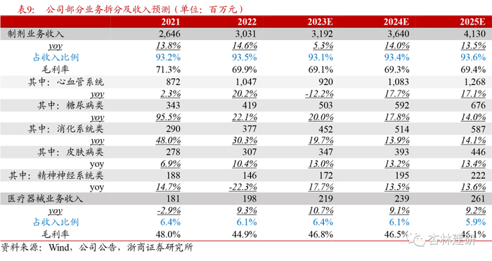 其他品种:结合相关品种在国内销售情况和审评节奏,我们预计复方α-酮酸片、开塞露、匹维溴铵片、哈西奈德溶液、黄体酮软胶囊等品种的增长主要来自于渠道下沉和市场扩容,我们估算该类产品2022年收入占比约28-30%,预计2023-2025年该类产品的收入CAGR在10%左右。