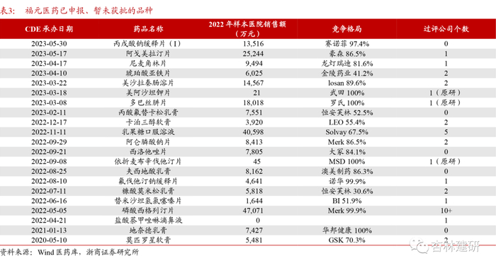 品种储备:多元化、首仿策略延续,开发110+亿元增量市场。截至2023年6月,公司已申报但暂未获批的品种样本医院销售总额达到23.5亿元(未放大),考虑到片剂、乳膏等在低等级医院和三终端使用较多,假设放大5倍,对应样本医院销售空间约110+亿元,其中较大的产品包括磷酸西格列汀片、乳果糖口服溶液等;从申报品种的过评情况和竞争格局看,公司延续首仿、多元化立项思路,大多数品种已过评厂商个数小于3家,我们看好公司新品种上市后带来的收入和利润增量