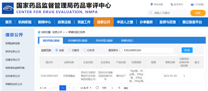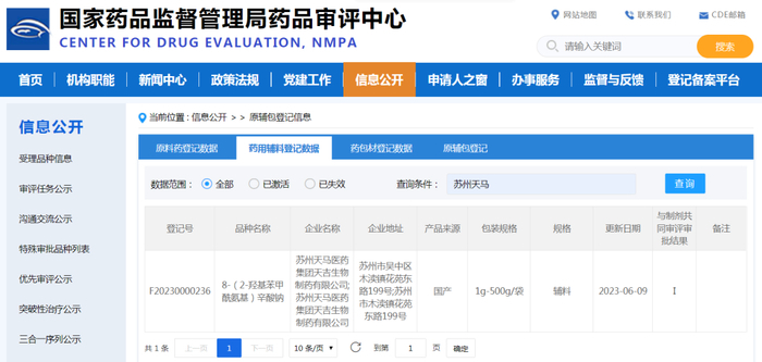 近日,苏州天马医药集团天吉生物制药有限公司(简称:天吉生物)研制的药用辅料8-(2-羟基苯甲酰胺基)辛酸钠(SNAC)登记号(F20230000236),已在CDE平台上公示!