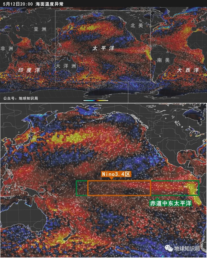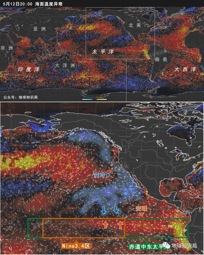 这是5月中旬的全球海表“距平温度”,黄色红色是偏暖,蓝色是偏冷。