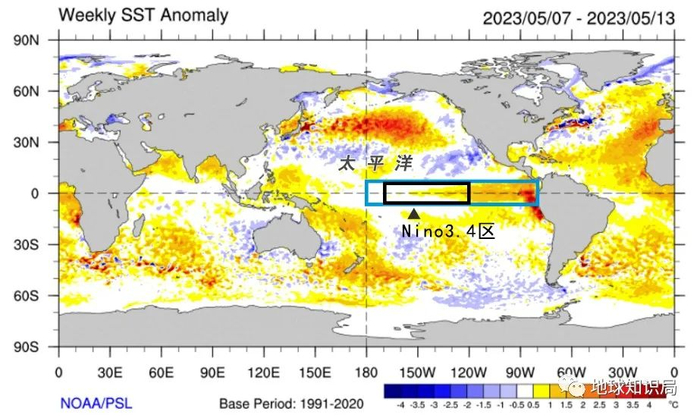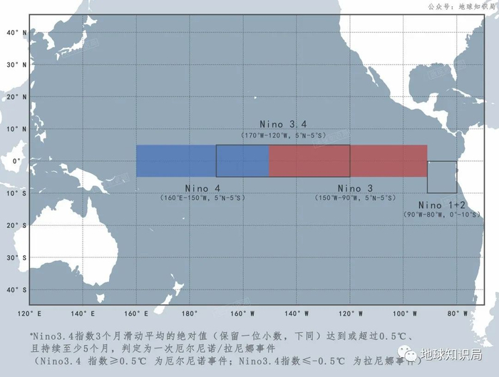 偏暖还是偏冷,需要一个基准,也就是“常年平均值”,一般用1981-2010年或1991-2020年的数据。选取5°S-5°N,170°W-120°W这个范围的平均海表温度,作为检测冷暖的标准,这里也被称为Nino3.4区,非常重要,后边我们还会提到。