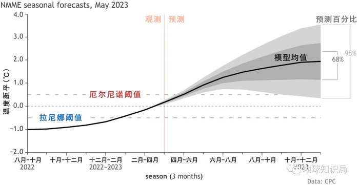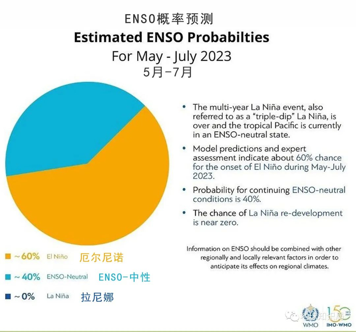 如果看今年的情况,5月初,世界气象组织表示拉尼娜在持续三年后已经结束热带太平洋处于中性状态,预计在5-8月,ENSO从中性转向厄尔尼诺的可能性会不断提高,从60%到80%,是大概率事件了。