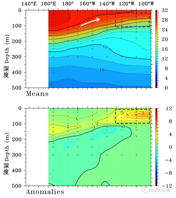 上为当前赤道太平洋地区海温距平的深度-经度剖面图