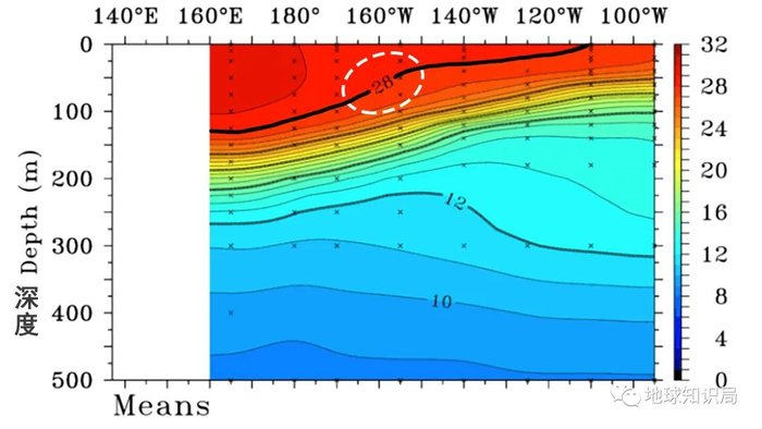 这张图,是五月中旬赤道太平洋海温的垂直剖面,东西跨度相当于从科隆群岛到所罗门群岛。
