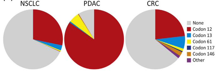 KRAS有很多不同类型突变形式,包括G12C、G12D、G12V和G13V等。G12等位基因突变在“三大”癌症NSCLC,PDAC和CRC中占主导地位。在NSCLC中,G13等位基因突变也占重要部分,而在PDAC密码子61突变中更为频繁。CRC在KRAS等位基因的多样性中脱颖而出。在这里,密码子12等位基因突变仅占KRAS所有突变的25%。