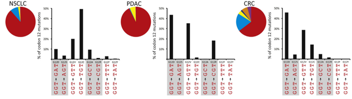 在NSCLC中,两个最常见的等位基因G12C和G12V是由相同类型的突变引起的,即G到T的转换。在PDAC和CRC中,最常见的突变都是G12D和G12V。