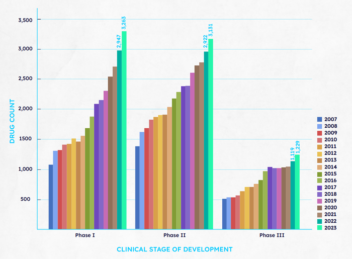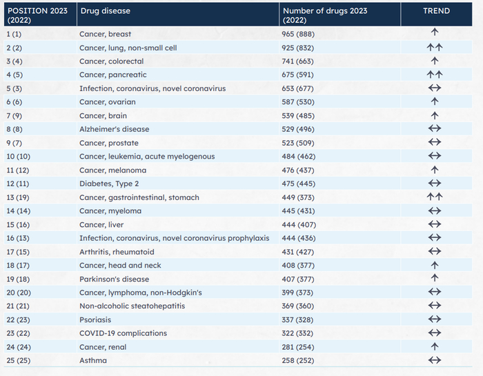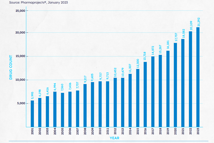 近日,全球权威医药智库信息平台 Informa Pharma Intelligence发布第31版《2023年医药研发趋势年度分析》白皮书(Pharma R&D Annual Review 2023),报告通过研究各知名药企、治疗领域、疾病、靶点和药物类型划分的制药研发管线来评估行业趋势,这些相关数据主要来自Pharmaprojects数据库,该数据自1980年以来一直在追踪全球药物的开发状况。