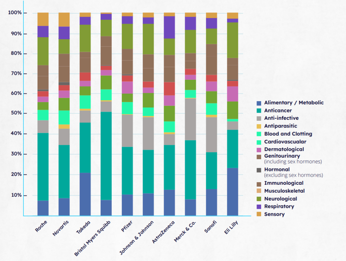 TOP10大型制药公司中有8家公司在所有14个治疗领域至少开发有一种新药,其中激素(hormonal)和抗寄生虫(antiparasitics)药物最为稀缺;抗癌药物是占比最大的治疗领域,目前有8480种治疗肿瘤的药物正在研发,占比所有研发药物管线39.8%,相比去年增长了9.1%,百时美施贵宝是TOP10中最为关注肿瘤治疗领域的公司,值得注意的是,礼来将药物研发关注点放在了消化/代谢药物上。
