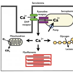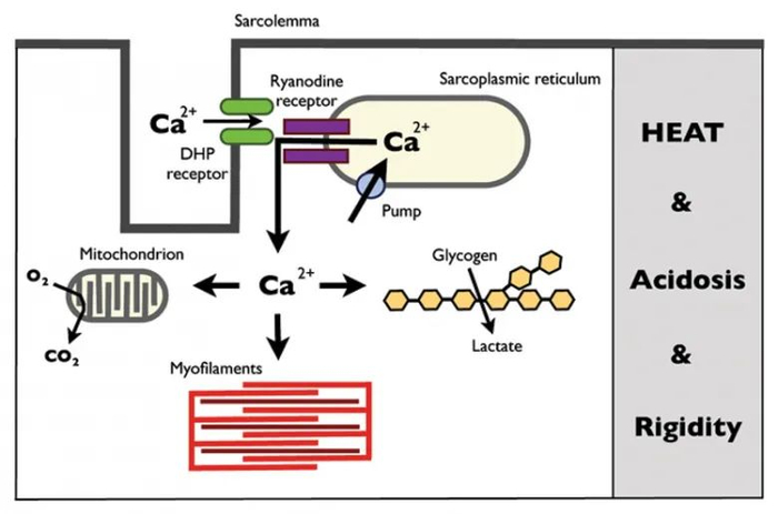 肌肉动作电位沿肌膜传播到横小管,在那里二氢吡啶受体(DHP受体)感知动作电位电压的变化而打开。打开的DHP受体的构象变化激活了兰尼碱受体(Ryanodine receptor),使钙从肌浆网释放出来。在恶性高热中,不受控制的钙从肌浆网中释放会破坏骨骼肌细胞内的代偿机制:增加肌肉收缩活动和随之产生的代谢刺激。