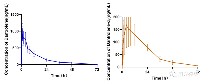 阳光德美开发并验证了具有高灵敏度、高特异性的高效液相色谱-质谱/质谱(HPLC-MS/MS,Nexera HPLC-TRIPLE QUAD 4500)定量分析方法,同时对人血浆中丹曲林及其代谢产物5-羟基丹曲林的浓度进行测定。该方法在样本处理环节需全程避光。项目负责人结合丰富的工作经验与技术能力,采用C4色谱柱(2.1×50mm,3μm),开发并验证了丹曲林及其代谢产物的定量分析方法,并成功应用于临床研究。该方法灵敏度高,定量下限低,分离度好,且用血量少(50 μL/1个样本),处理方法简便、快捷,分析时间短(3.5 min/1个样本),最终高效地完成了丹曲林及其代谢产物5-羟基丹曲林的生物样本分析工作,极大推进了丹曲林的申报进程。