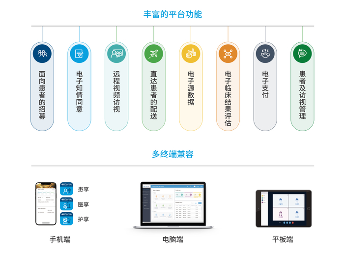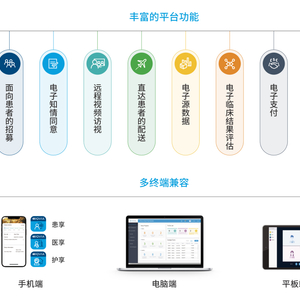 平台集成了面向患者的招募、电子知情同意、远程视频访视、直达患者的配送、电子源数据、电子临床结果评估、电子支付、患者及访视管理等多种远程临床研究功能,可定制搭建电脑、平板和手机终端使用,适用于不同场景和用户,以更高效的整合平台,更灵活的可扩展模块,助力高效、高质的临床试验。