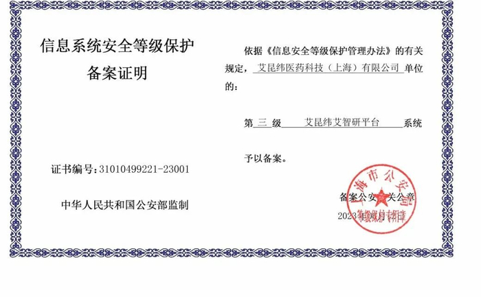 近日,IQVIA“艾智研”平台根据《信息系统安全等级保护测评要求》等技术标准,通过自主定级、专家评审、定级备案、现场测评等程序,顺利获得由国家公安部颁布的信息系统安全等级第三级认证证书(Multi-level Protection of Information Security)。“艾智研” 平台测评内容涵盖等级保护安全技术要求及安全管理要求等,包含信息保护、安全审计、通信保密等在内的近300项要求,最终以高分顺利获得第三级的信息系统认证。“艾智研”平台致力于保护信息系统重要资产、重视患者隐私信息保护及数据安全、降低信息安全风险,持续提供更加安全可靠的服务,为客户提供最优质的去中心化临床试验解决方案。