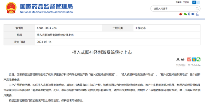 6月14日,中国国家药监局(NMPA)官网公示,已批准承诺医疗生产的“植入式骶神经刺激器”、“植入式骶神经刺激延伸导线”、“植入式骶神经刺激电极”三个创新产品的注册申请。三个产品配套使用,构成植入式骶神经刺激系统,其核心技术具有自主知识产权。