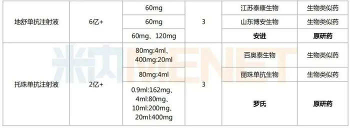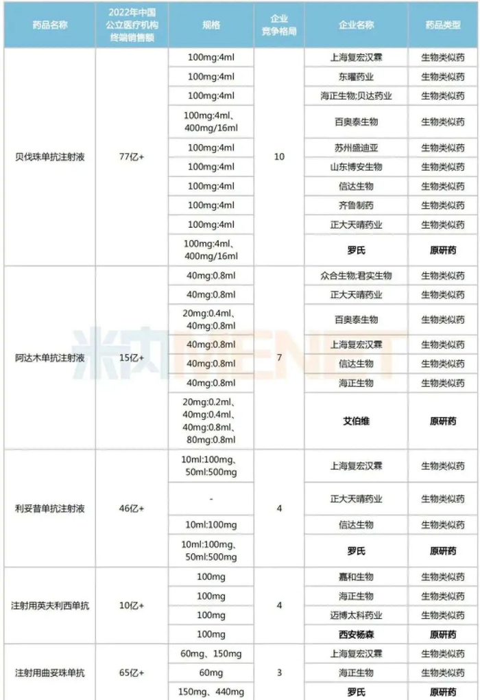 据此前米内网不完全统计,国内生物药及生物类似药获批企业≥3家的品种已有7个,包括贝伐珠单抗注射液、注射用曲妥珠单抗、利妥昔单抗注射液、阿达木单抗注射液、注射用英夫利西单抗、地舒单抗注射液以及托珠单抗注射液。