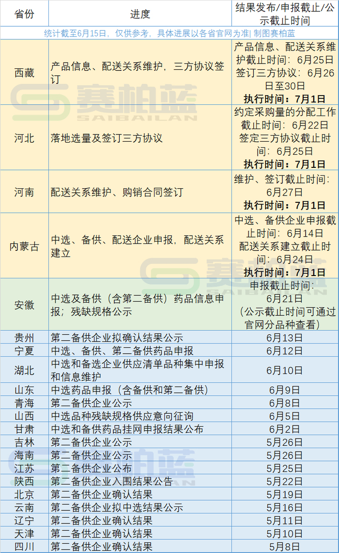 据赛柏蓝统计,截至6月15日,西藏、河北、河南、内蒙古4省已确定第八批国采执行时间;安徽正在展开中选、备供、第二备供药品信息申报以及残缺规格公示工作,预计将在本月下旬正式公布执行时间;另有贵州、宁夏、湖北等16省已有相关动作;而广东、浙江、湖南、江西等省目前暂未公开发布最新进展。