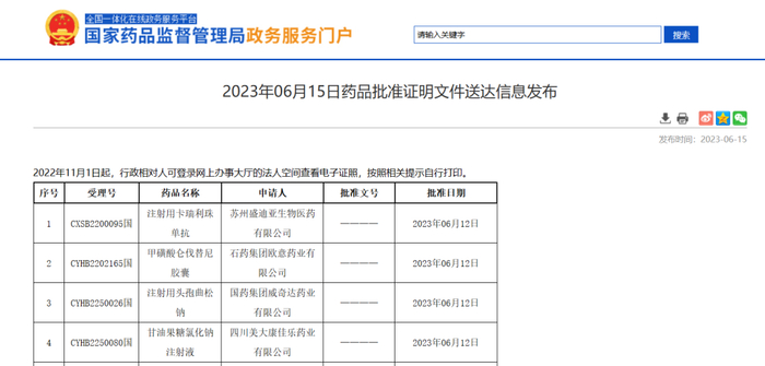 6月15日,国家药监局发布最新一批药品批准证明文件送达信息,其中出现了注射用卡瑞利珠单抗、贝伐珠单抗注射液、乌司奴单抗注射液的身影。
