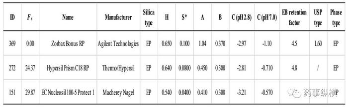 Fs-此参数用来衡量两款色谱柱的相似度。Snyder/Dolan法中,如果Fs≤3,可认为两款色谱柱相互替代。利用这个参数,可以帮助我们查找相似的色谱柱。比如药典方法规定的色谱柱,如果暂时没有,可利用此参数查找替代品。如果方法开发中,某色谱柱无法满足分离要求,此时需要查找与所用色谱柱Fs值差异较大的色谱柱,这样才能提供不同的分离效果。