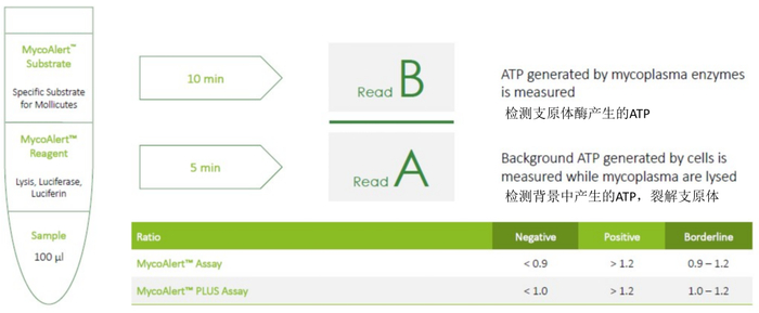 Lonza MycoAlert™支原体检测试剂盒主要有两大优势:1)操作简单;2)检测时间短。其通过检测在支原体和其柔膜细菌中存在的乙酸激酶和氨基甲酸激酶的活性,完成支原体检测。仅需两步简单操作,20分钟即可完成检测。这两种酶在导致95%支原体污染的6个种属和大多数的柔膜细菌中均存在,但在真核细胞中不存在,此法既可保证检测的准确性,又可快速完成检测。