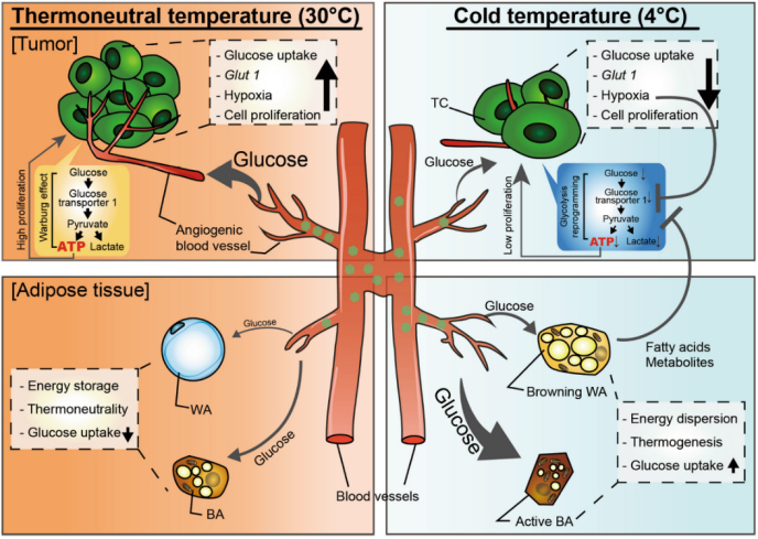 在热中性温度下,癌细胞主要通过糖酵解获得能量,即糖酵解Warburg效应。肿瘤中的血管生成血管提供足够的葡萄糖供肿瘤消耗。WAT脂肪细胞(WAs)和BAT脂肪细胞(BAs)都保持代谢惰性,没有显著的葡萄糖摄取和产热活性。糖酵解产生的ATP分子和其他代谢物支持肿瘤细胞高速增殖。在寒冷的环境下,sWAT和BAT经历褐变过程,显著增加葡萄糖摄取和产热。由于活化的BAT和sWAT中葡萄糖摄取升高,肿瘤中的葡萄糖摄取显著减少。因此,低温暴露下的肿瘤生长通过几种可能的机制受到抑制: