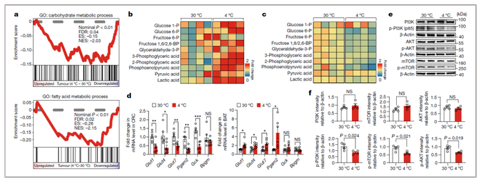 e-f:与抑制肿瘤糖酵解一致,CRC肿瘤中磷脂酰肌醇-3激酶(PI3K)、AKT和哺乳动物雷帕霉素靶蛋白(mTOR)的激活也被冷暴露显著抑制。