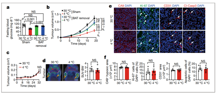 b:重要的是,BAT的去除几乎消除了冷刺激对肿瘤的抑制作用;相比之下,在30°C下,BAT去除对肿瘤生长没有影响;