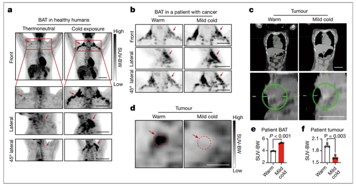 为了在各种动物模型中研究该发现与人类的相关性,作者在健康人类和癌症患者中进行了可耐受的低温刺激。研究招募了健康志愿者(3男3女,年龄在22至25岁之间)。这些健康个体穿着非常轻薄的衣服,每天处于在16°C的微冷环境中2-6小时,连续14天。