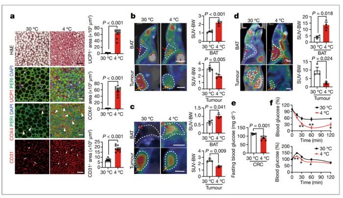 b-d:接下来,通过PET-CT成像分析测量荷瘤小鼠各器官对18f-氟脱氧葡萄糖(18F-FDG)的摄取,在30°C下,18F-FDG分布主要在肿瘤中积累,在BAT中发现了适度的信号,然而,4°C下显著刺激了18F-FDG在肩胛骨间BAT (iBAT)中的分布,尽管不同温度下肿瘤大小大致相等,但在肿瘤中几乎检测不到18F-FDG信号
