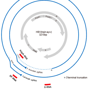 注释:全长 pgRNA 和 3′末端截短的 pgRNA 显示为实线或虚线曲线。红色粗体曲线代表血清HBV RNA的扩增子检测。
