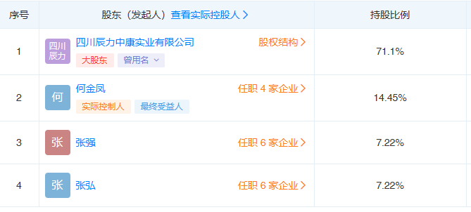 天眼查信息显示:四川协力制药股份有限公司的第一大股东为四川辰力中康实业有限公司(实控人何金凤)、第二股东为何金凤、张强和张弘兄妹各持股7.22%,同为第三大股东。