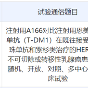 中国药物临床试验登记与信息公示平台官网公示,科伦博泰已经在中国启动一项3期临床研究,评估注射用A166对比注射用恩美曲妥珠单抗(T-DM1)治疗既往接受过曲妥珠单抗和紫杉类治疗的HER2阳性不可切除或转移性乳腺癌患者的有效性和安全性。公开资料显示,A166是一款靶向HER2的创新抗体偶联药物(ADC),已经于今年5月在中国递交上市申请,拟定适应症为既往经二线及以上抗HER2治疗失败的HER2阳性不可切除的局部晚期、复发或转移性乳腺癌。