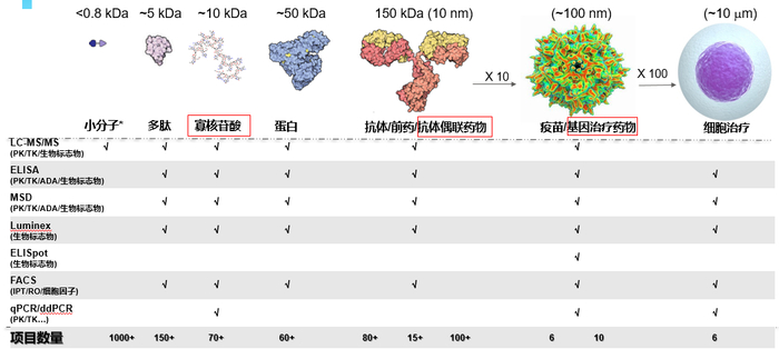 ▲药明康德各测试部门具有完善的质量标准体系、丰富的新药研发经验,以及完整的测试能力。图为生物分析服务覆盖的新分子类型和服务平台