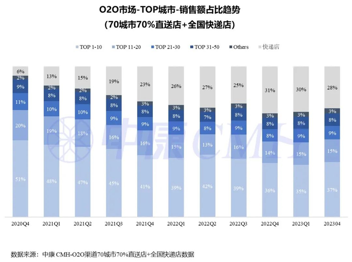 高线城市的市场规模集中度更高,超三分之一市场规模由排名Top10城市贡献。全国快递店药品市场规模快速扩容,由2020年第四季度的6%扩至2023年4月的28%。