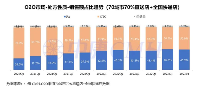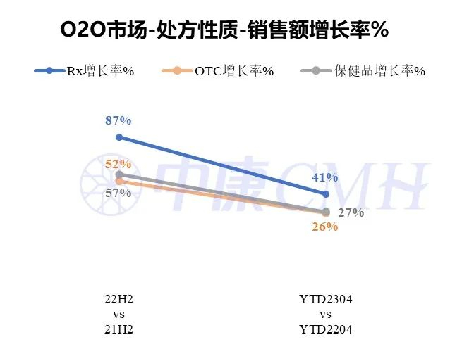 中康CMH数据显示,自2021年底以来,处方药占O2O药品零售市场占比持续上涨,逐步与OTC市场抗衡。截止至2023年4月,处方药市场占整体医药电商-O2O市场规模逼近OTC市场,比例达45.9%。从趋势上看,2023年处方药增速远超OTC药物及保健品。