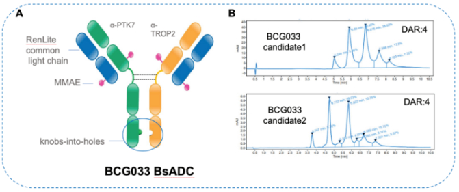 BCG033是一款靶向PTK7 和 TROP2全人双抗ADC药物,双抗是通过百奥赛图RenLite平台生成。PTK7和TROP2在TNBC,以及包括卵巢癌、非小细胞肺癌在内的多种实体瘤中具备强共表达。