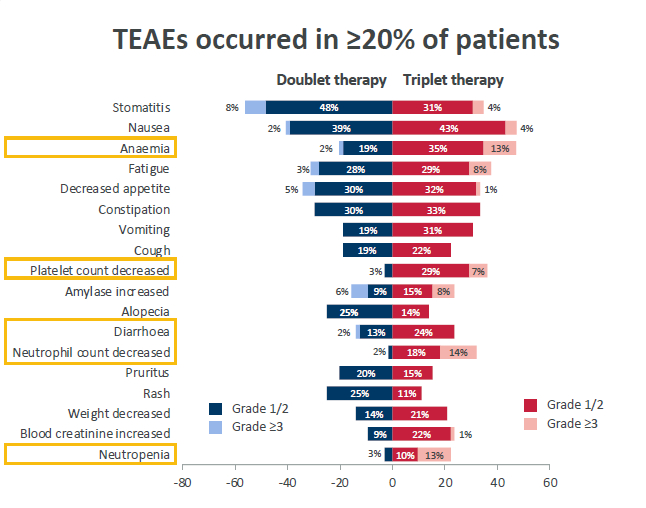 Dato-DXd双联和三联方案均显示出了可耐受的安全性,且未发生新的安全性信号。其中在双联组和三联组最常见治疗期间出现的不良事件(TEAEs)分别是口腔炎(56%和35%)、恶心(41%和47%)、贫血(21%和48%)和疲劳(31%和37%),且大部分为1/2级。
