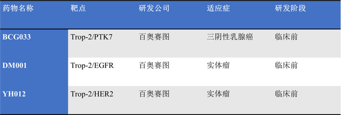 除了单靶点之外,百赛奥图靶向Trop-2的双抗ADC产品BCG033、DM001和YH012也吸引人们的关注。