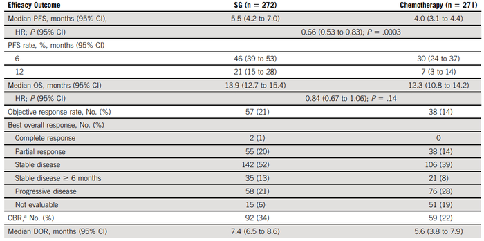 SG组的中位PFS为5.5个月(95%CI,4.2至7.0),化疗组为4.0个月(95%CI,3.1至4.4);6个月和12个月的PFS分别为46%(95%CI,39至53)vs 30%(95%CI,24至37)和21%(95%CI,15至28)v 7%(95%CI,3至14)。中位总生存期(首次计划的中期分析)尚未成熟(风险比,0.84;P = .14)。关键≥3级治疗相关不良事件(SG v化疗)为中性粒细胞减少(51% vs 38%)和腹泻(9% v 1%)。