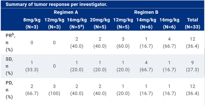 临床I期研究表明,截止2022年10月21日,38名入组患者被纳入分析,可评估的患者中,ORR为33.3%,疾病控制率为80.0%。安全性方面,4名患者报告了DLT,均为3级口腔炎(6.0 mg/kg,n=3;4.0 mg/kg,n=1),没有患者因TRAEs而中断研究治疗。