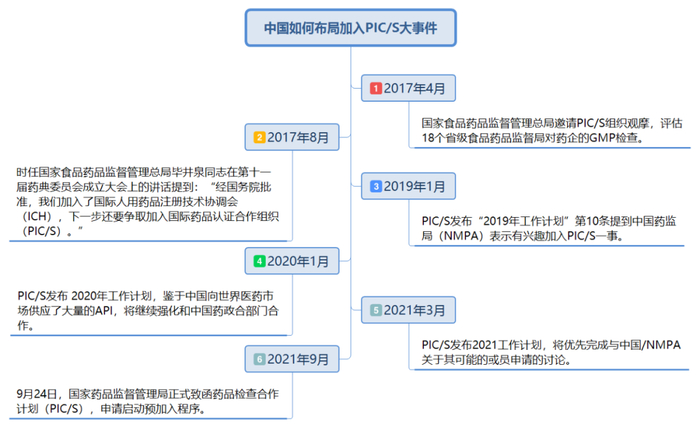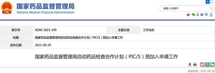 2021年09月24日,国家药品监督管理局正式致函药品检查合作计划(PIC/S),申请启动预加入程序。当前我国已经完成预申请阶段工作,计划今年提出正式加入申请。