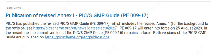 近日,PIC/S发布了最新的GMP指南,新版指南将于2023年08月25日开始执行。