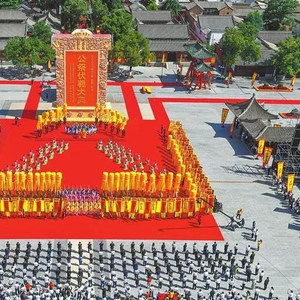 圣乐袅袅,舞姿绰约。在阵阵礼乐声中,以“弘扬 传承 创新”为主基调,以“曦开迎圣”“厥功大德”“万代敬仰”“福佑中华”为主要内容的《乐舞告祭》把大典推向了高潮。