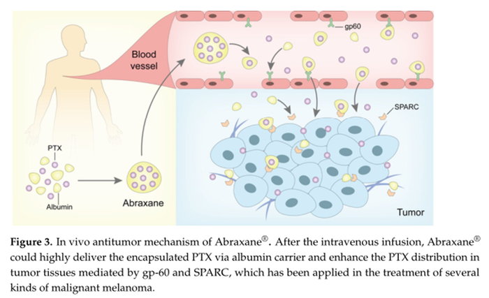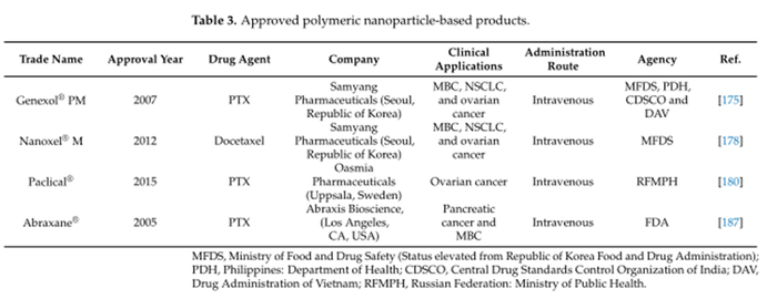 聚合物纳米粒可以包裹各种活性化合物,如抗肿瘤药物、siRNA、蛋白质和造影剂[183]。到目前为止,只有一种商业化的聚合物纳米粒:白蛋白结合型紫杉醇(Abraxane®),FDA于2005年批准其用于治疗胰腺癌和MBC。临床试验中,Abraxane®不仅保持了PTX的抗肿瘤作用,还消除了Taxol®中与Cremophor®EL相关的毒性。