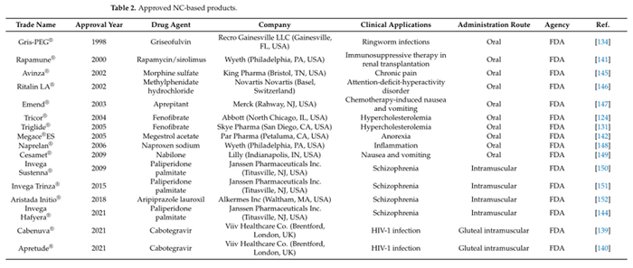 在过去的二十年里,超过15个NCs被批准用于临床。NCS通过多种给药途径提供疏水药物,并在许多不同领域表现出色,如高载药量、长期稳定性、增强释放、屏障穿透和易于扩展的技术。值得注意的是,由于其极高的载药量,NCS是最有希望实现长期抗病活性的纳米药物。